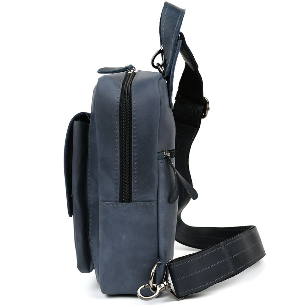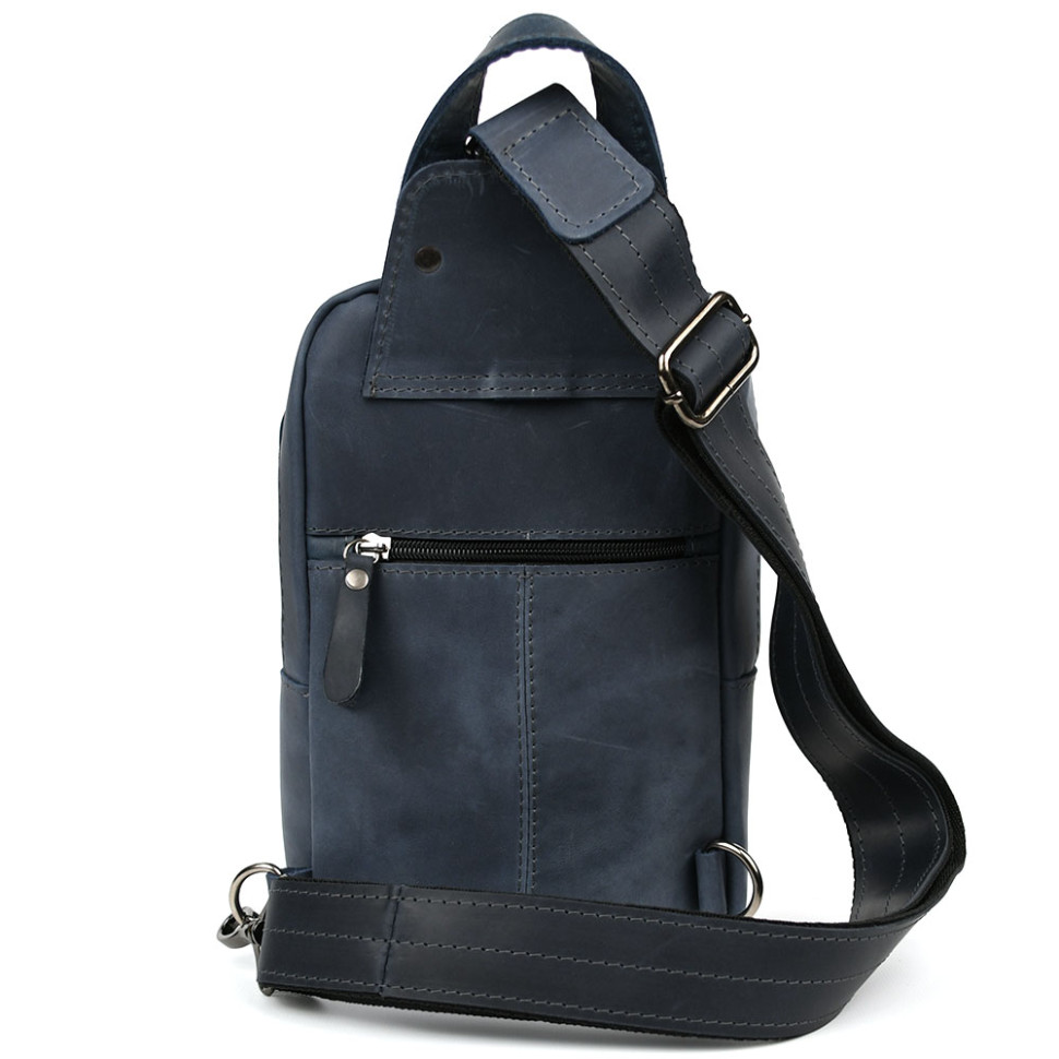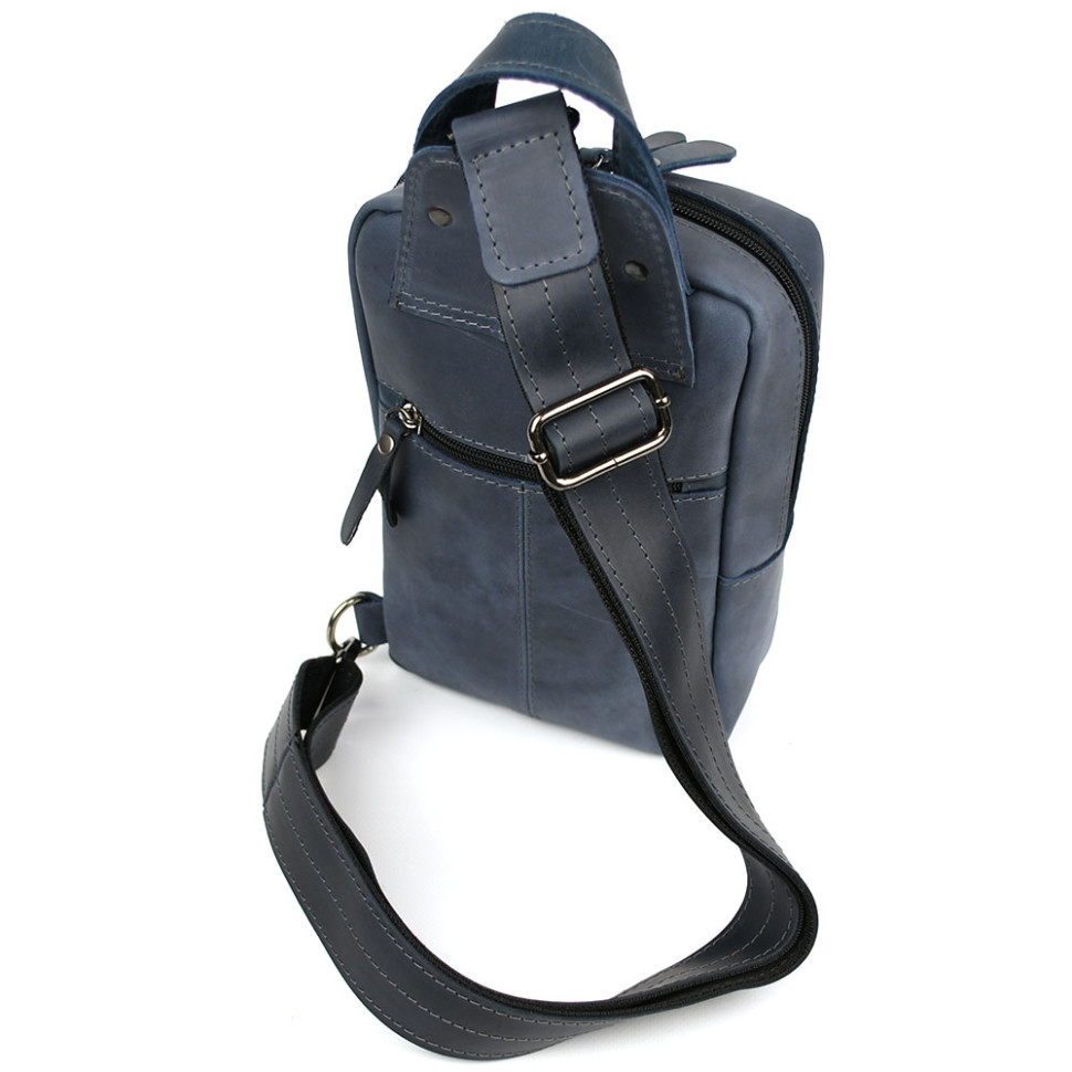 Чоловічий нагрудна сумка слінг рюкзак на одне плече Limary lim-910RK зі шкіри крейзі хорс, синій. Матеріал нагрудної сумки: натуральна шкіра крейзі хорс Одне основне відділення на спіральній блискавці Передня вертикальна кишеня на кнопці Розмір: 29*16*8 см