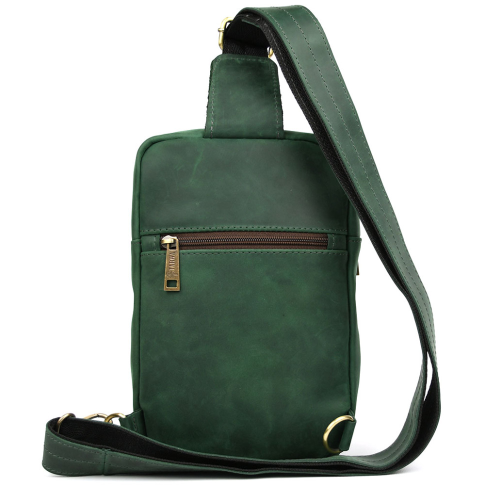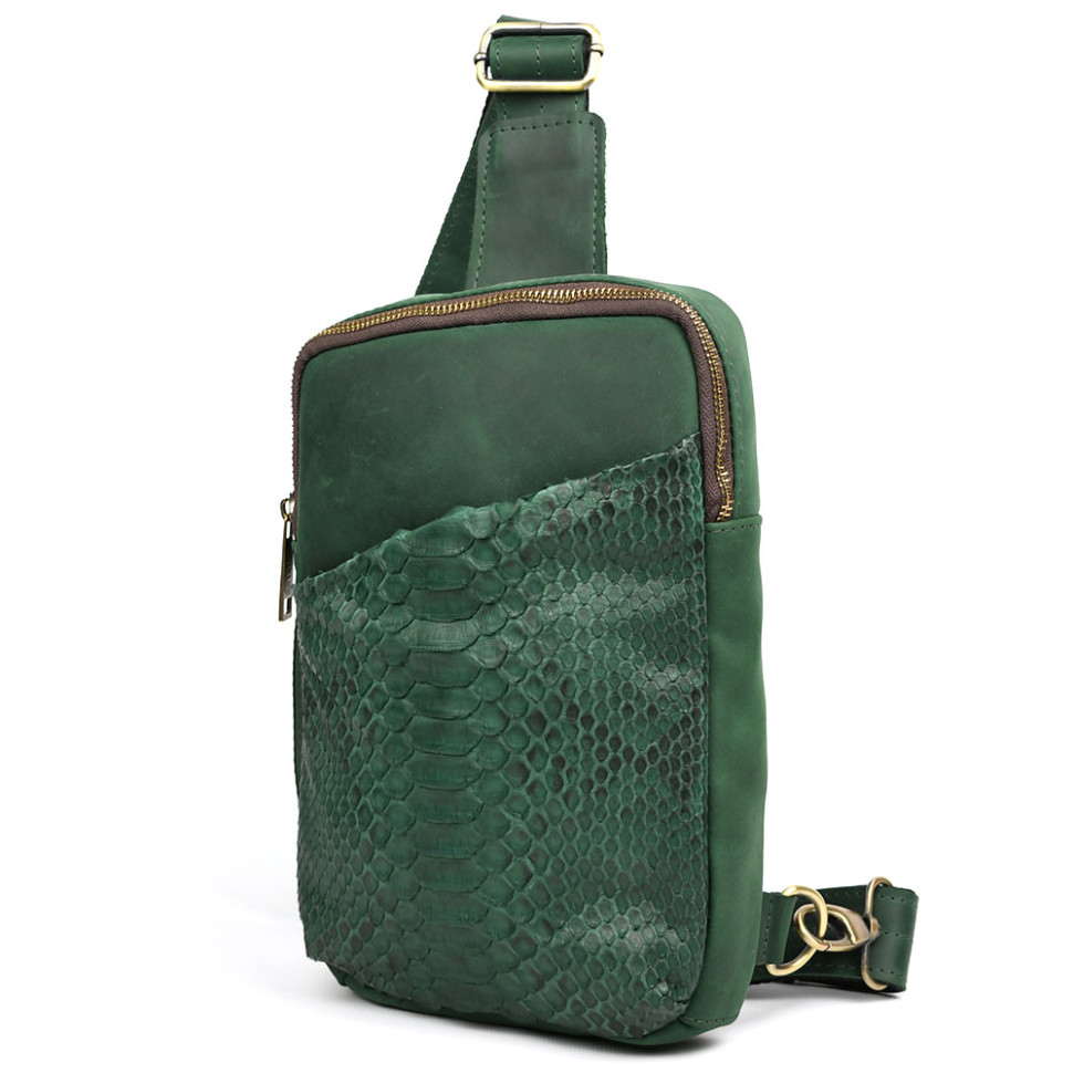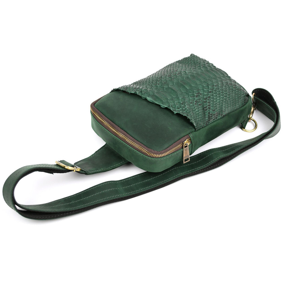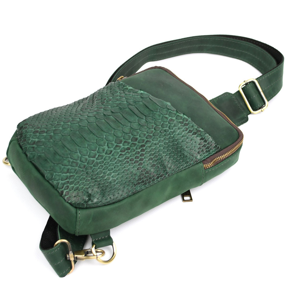 Чоловічий зелений слінг зі шкіри крейзі хорс і пітон REREP-0204-3md TARWA. Зручний та практичний аксесуар, виготовлений з натуральної кінської шкіри та передньої лицьової сторони з натуральної шкіри пітона. Стильна модель ідеально підійде для кожного дня. Аксесуар має одне відділення, всередині якого є врізна кишеня на блискавці та відрита кишеня для телефону або портмоне.