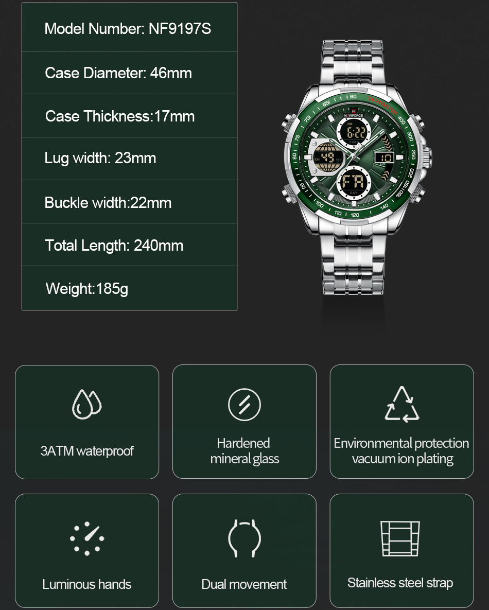 Бренд Naviforce спеціалізується на створенні годинників, які не тільки вражають своїм стильним дизайном, але й відповідають високим стандартам довговічності та захисту від негативних зовнішніх факторів.Тактичні годинники Naviforce відрізняються своєю високою стійкістю до механічних пошкоджень і зносу. Вони витримують удари, падіння й надзвичайні навантаження, що забезпечує їх надійну функціональність навіть в найскладніших умовах. Під час занять спортом, активного відпочинку або професійних завдань, годинники Naviforce готові вистояти перед випробуваннями.Щоб забезпечити точний хід годинників, комплектуються оригінальними кварцовими механізмами від відомих виробників, таких як Citizen і Seiko. Ці механізми відомі своєю надійністю, точністю та довговічністю, що гарантує, що годинники Naviforce будуть служити вам протягом багатьох років.В комплекті йде офіційна гарантія на 12 місяців.