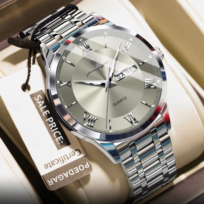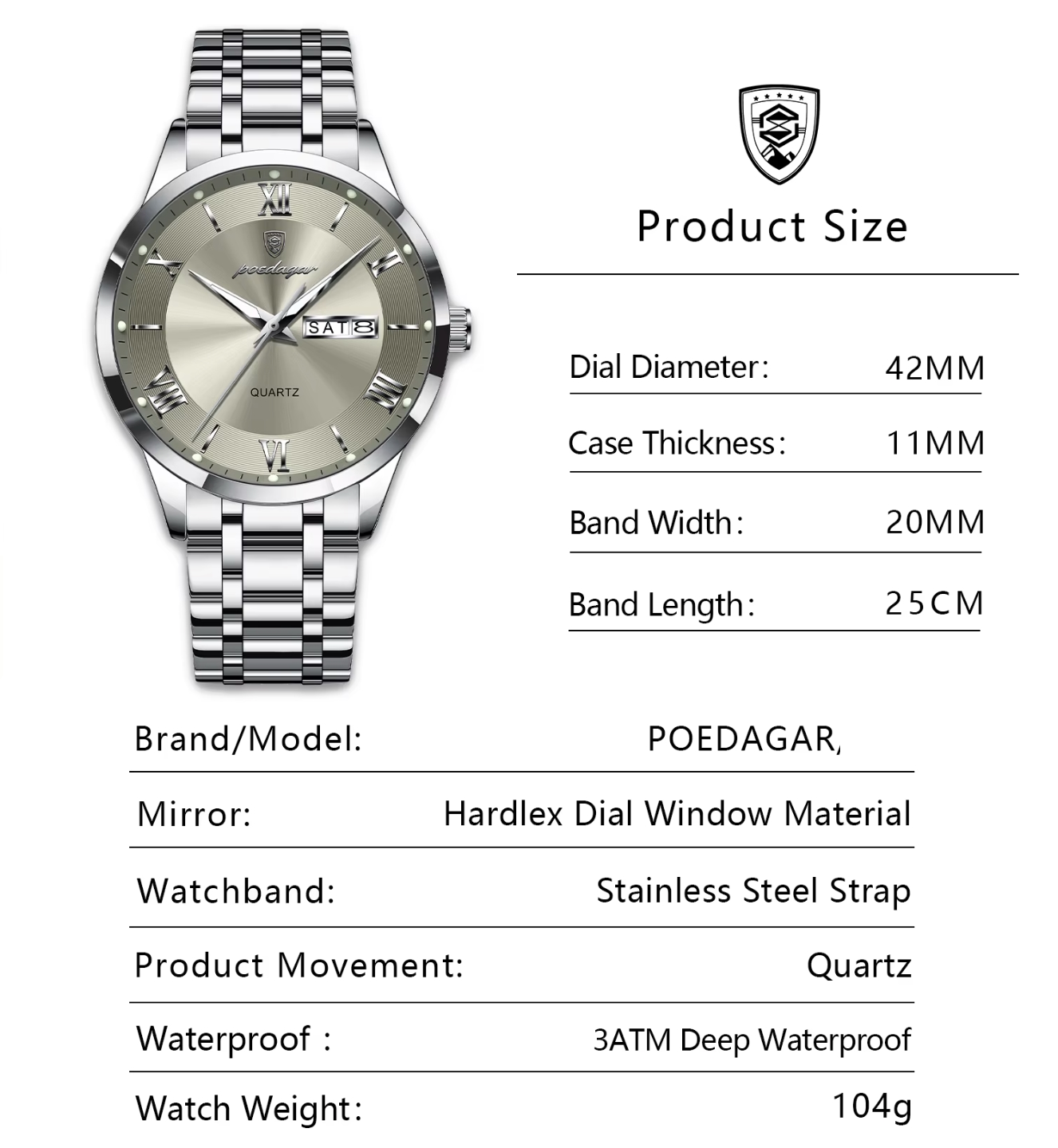 Poedagar – це поєднання елегантності, точності та сучасного стилю. Годинники цього бренду створені для тих, хто цінує витонченість у деталях та прагне підкреслити свою індивідуальність.Кожна модель Poedagar – це:Якісні матеріали: нержавіюча сталь, міцне мінеральне скло, надійні кварцові механізми.Стильний дизайн: від класичних рішень до сучасних спортивних форм.Функціональність: водозахист, індикатор дати, світловідбивні стрілки та інші корисні функції.Poedagar – це ідеальний вибір для ділових зустрічей, повсякденного стилю або особливих подій. Це не просто годинник – це вираз вашого смаку, впевненості та стилю.В комплекті йде офіційна гарантія на 12 місяців.Примітка: Ремінець який зображено на головному фото являється додатковим і вкладається в посилку окремо.