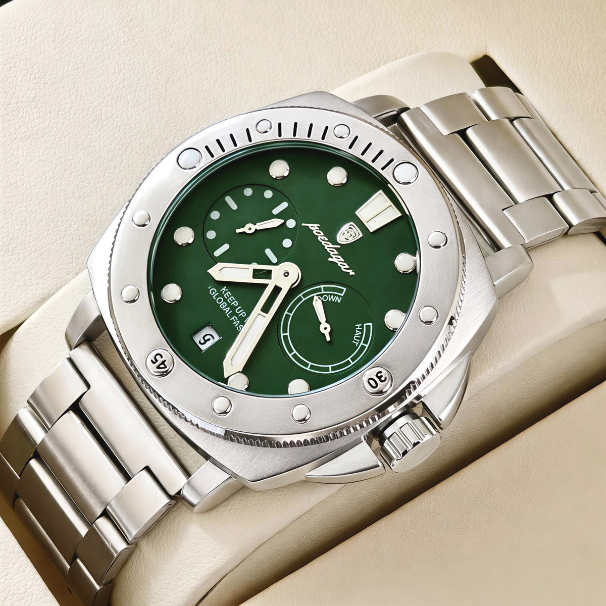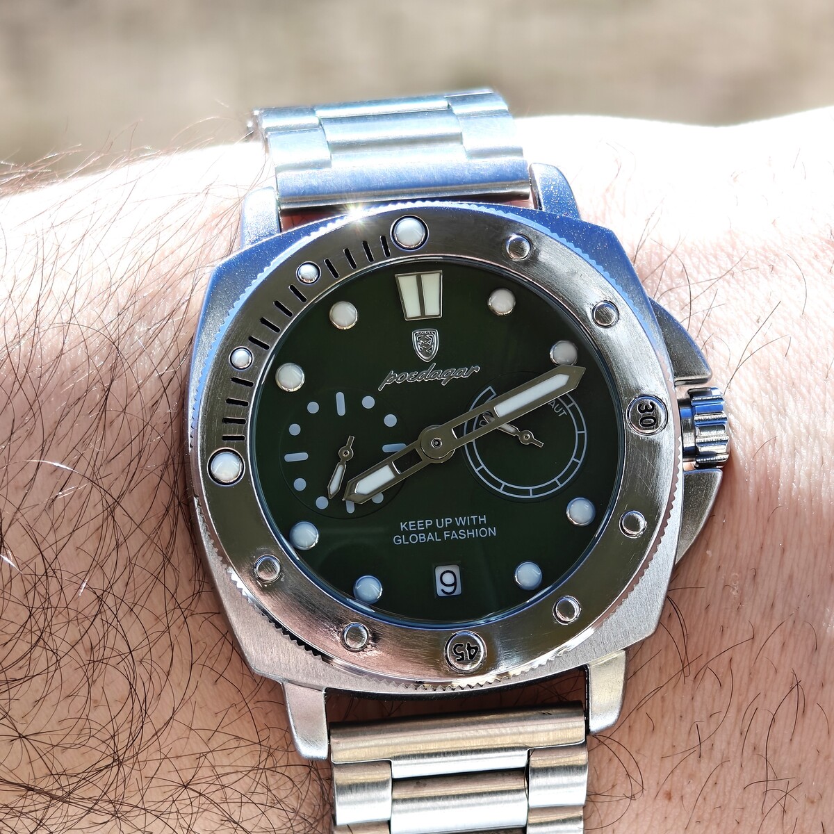 Poedagar – це поєднання елегантності, точності та сучасного стилю. Годинники цього бренду створені для тих, хто цінує витонченість у деталях та прагне підкреслити свою індивідуальність.Кожна модель Poedagar – це:Якісні матеріали: нержавіюча сталь, міцне мінеральне скло, надійні кварцові механізми.Стильний дизайн: від класичних рішень до сучасних спортивних форм.Функціональність: водозахист, індикатор дати, світловідбивні стрілки та інші корисні функції.Poedagar – це ідеальний вибір для ділових зустрічей, повсякденного стилю або особливих подій. Це не просто годинник – це вираз вашого смаку, впевненості та стилю.В комплекті йде офіційна гарантія на 12 місяців.Годинник комплектується 2 ремінцями: Основний – нейлоновий зелений;Додатковий – сріблястий металевий браслет.