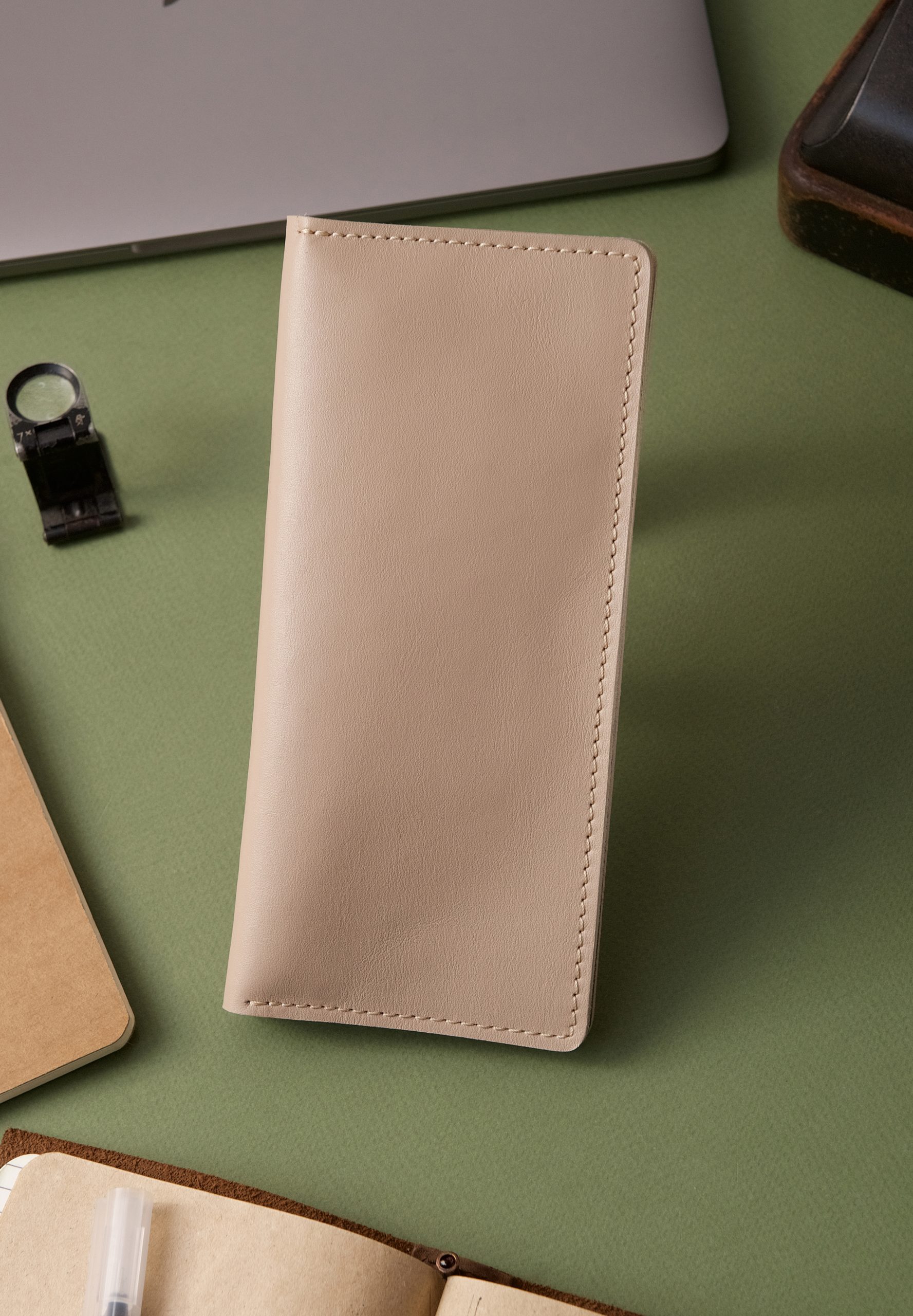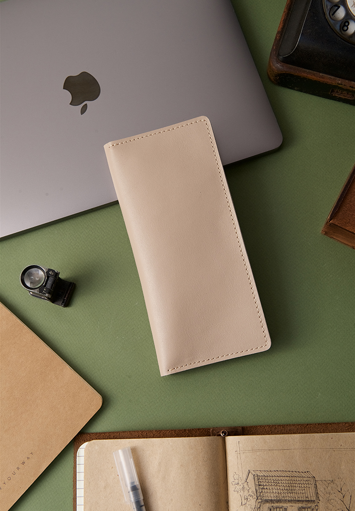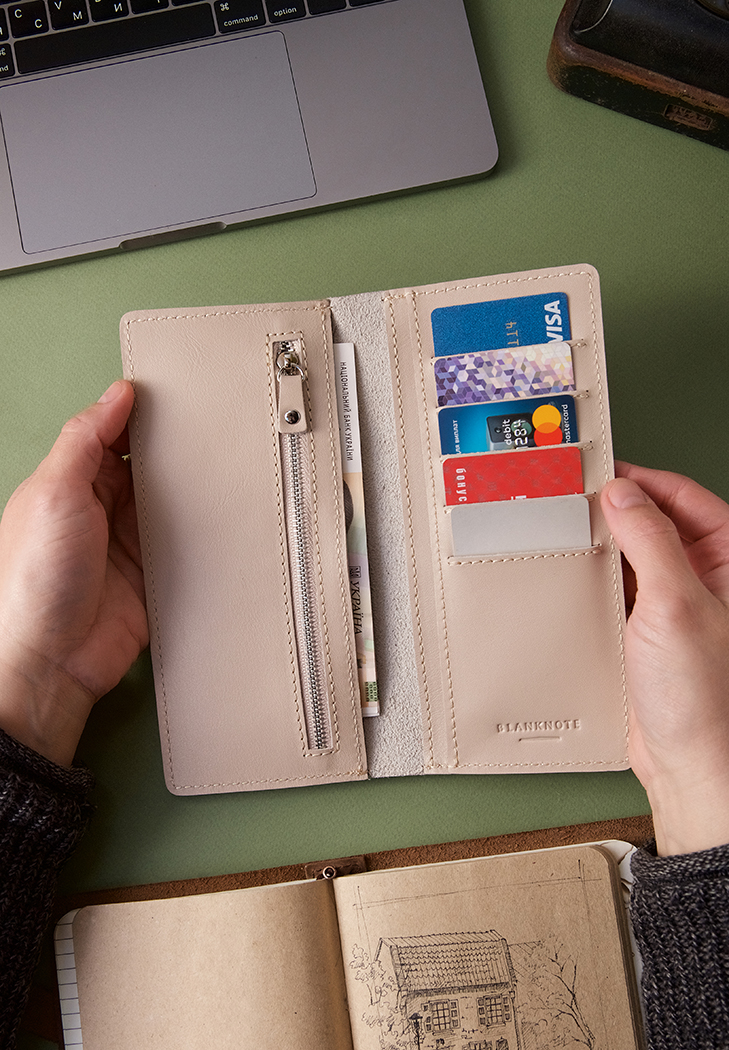 Місткий гаманець у ніжному світло-бежевому відтінку стане елегантним і практичним рішенням для зберігання ваших карток, готівки та документів. Аксесуар виготовлений вручну з міцної натуральної шкіри краст, що забезпечує довговічність і приємні тактильні відчуття.