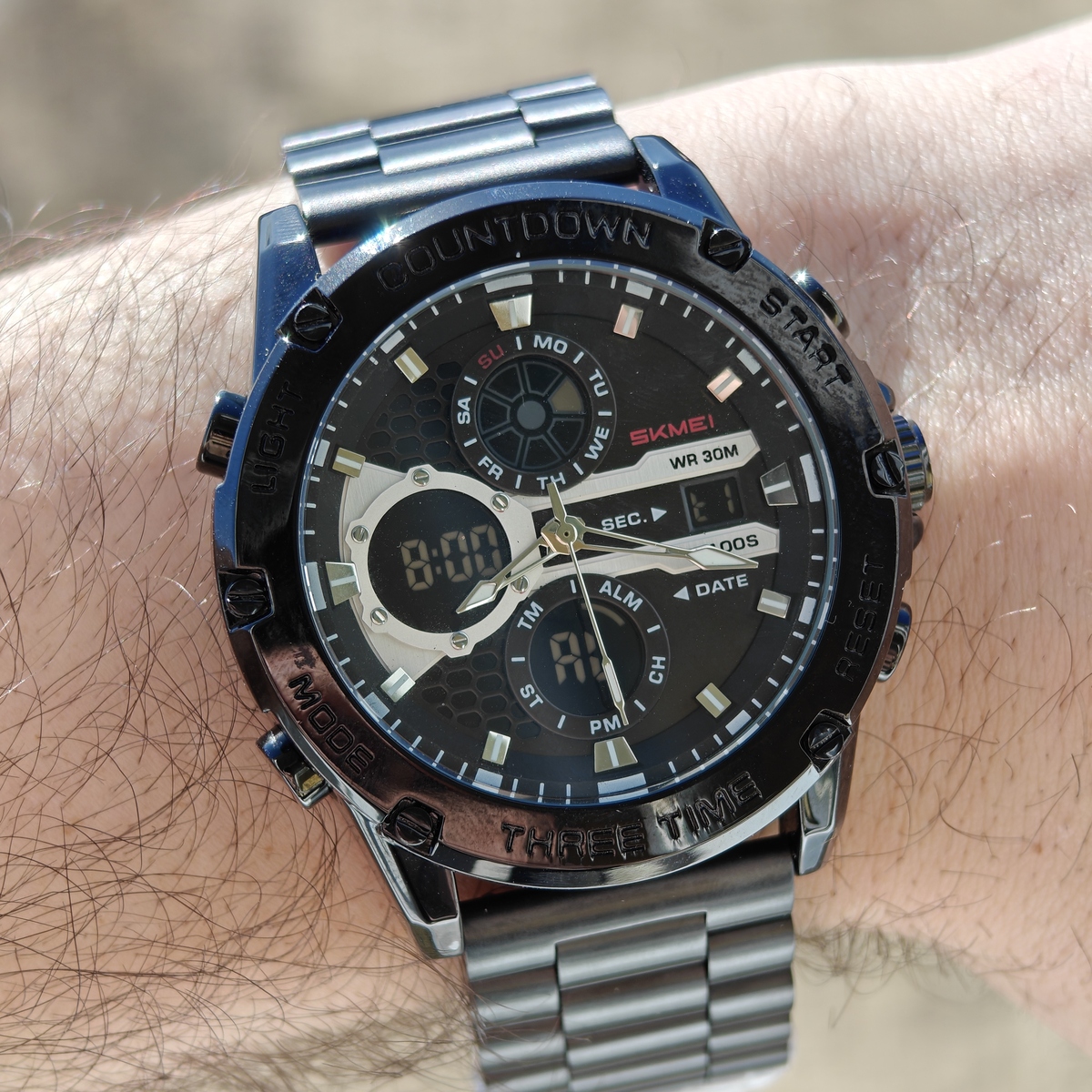 Функції: Секундомір, таймер, будильник, підсвічування, час показується на циферблаті й стрілками, дата, день тижня, місяць